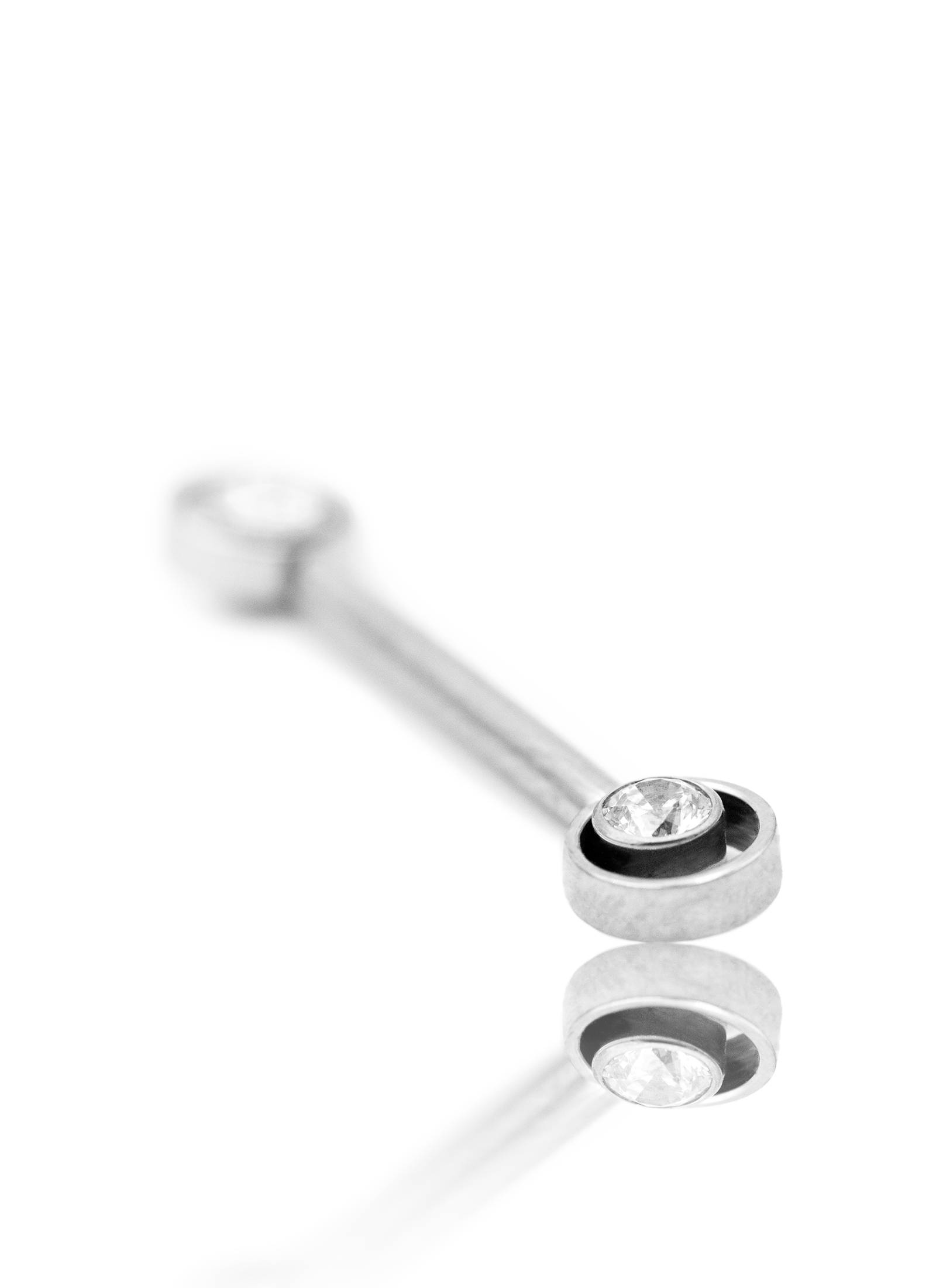 Połączenie gładkiego wykończenia z dwiema lśniącymi cyrkoniami daje efekt subtelnego luksusu. Idealna propozycja do sutków – wygodna i stylowa.