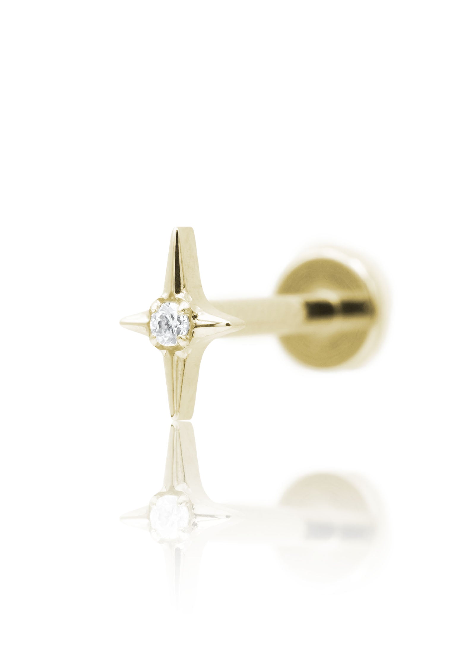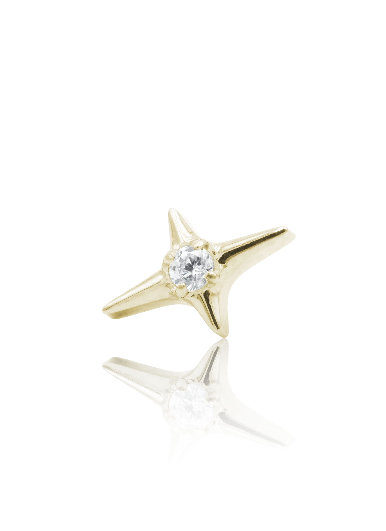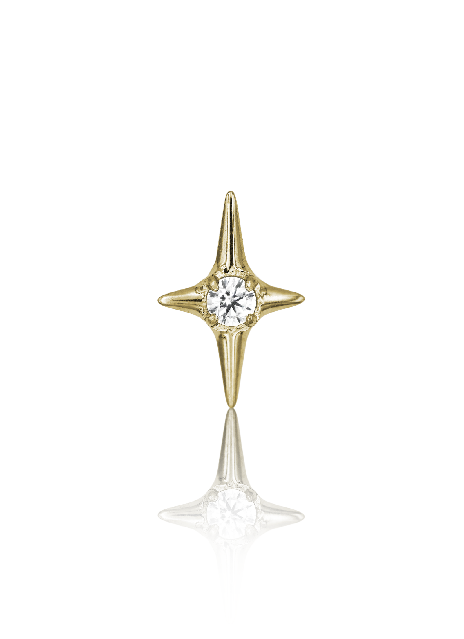 „Long Star” w złotej odsłonie zachwyca elegancją i kosmiczną formą. Smukła, czteroramienna oprawa w odcieniu luksusowego złota otacza centralną, mocno błyszczącą cyrkonię, tworząc efekt świetlistej gwiazdy. To model, który podkreśli każde przekłucie i doda mu szlachetnego, minimalistycznego glow.