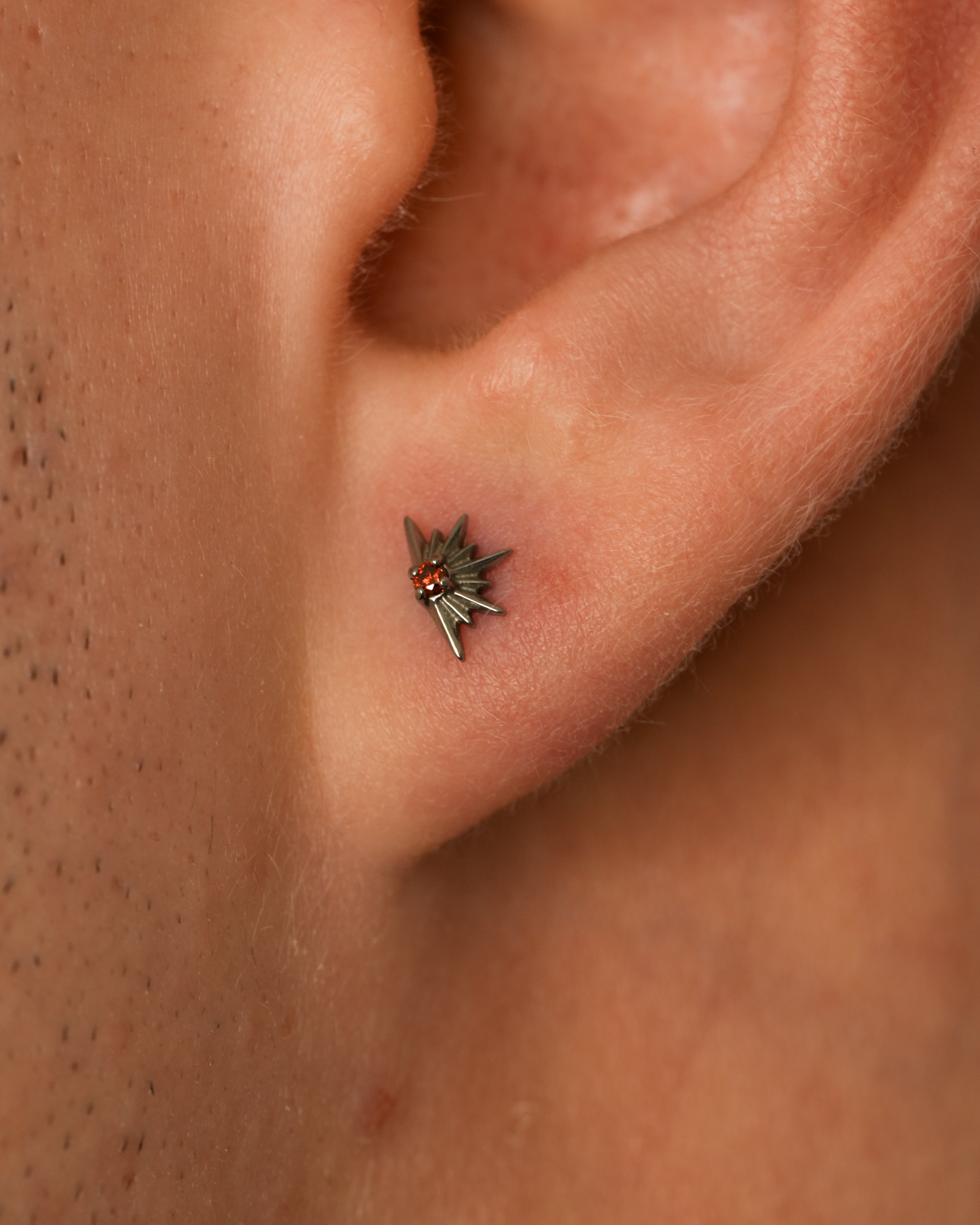 „Silver Red Sunset” to kolczyk, który łączy surową, srebrną oprawę z intensywnie czerwonym kamieniem, tworząc efekt przypominający ostatnie promienie słońca tuż przed zmrokiem. Dynamiczne, ostre kształty otaczające centralny kamień nadają całości energii i wyjątkowego charakteru. Ten model świetnie sprawdzi się zarówno w minimalistycznej stylizacji, jak i jako mocny akcent w ułożeniu ear styling.