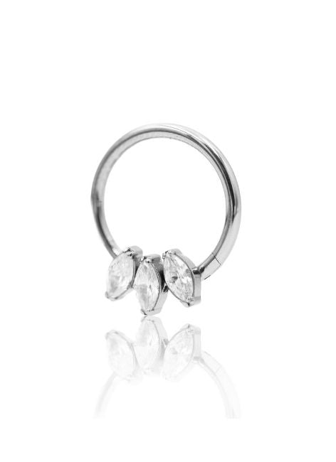 „Triver” to tytanowy clicker ozdobiony trzema cyrkoniami w kształcie łezki, które układają się w elegancki „cluster” pod obręczą. Daje subtelny, biżuteryjny blask i wygląda świetnie zarówno solo, jak i w zestawach.