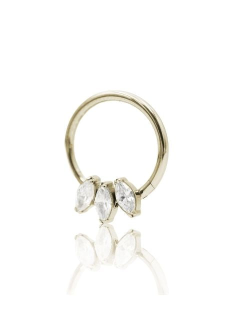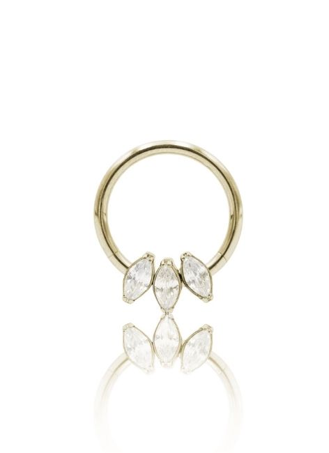 „Triver” to tytanowy clicker ozdobiony trzema cyrkoniami w kształcie łezki, które układają się w elegancki „cluster” pod obręczą. Daje subtelny, biżuteryjny blask i wygląda świetnie zarówno solo, jak i w zestawach.