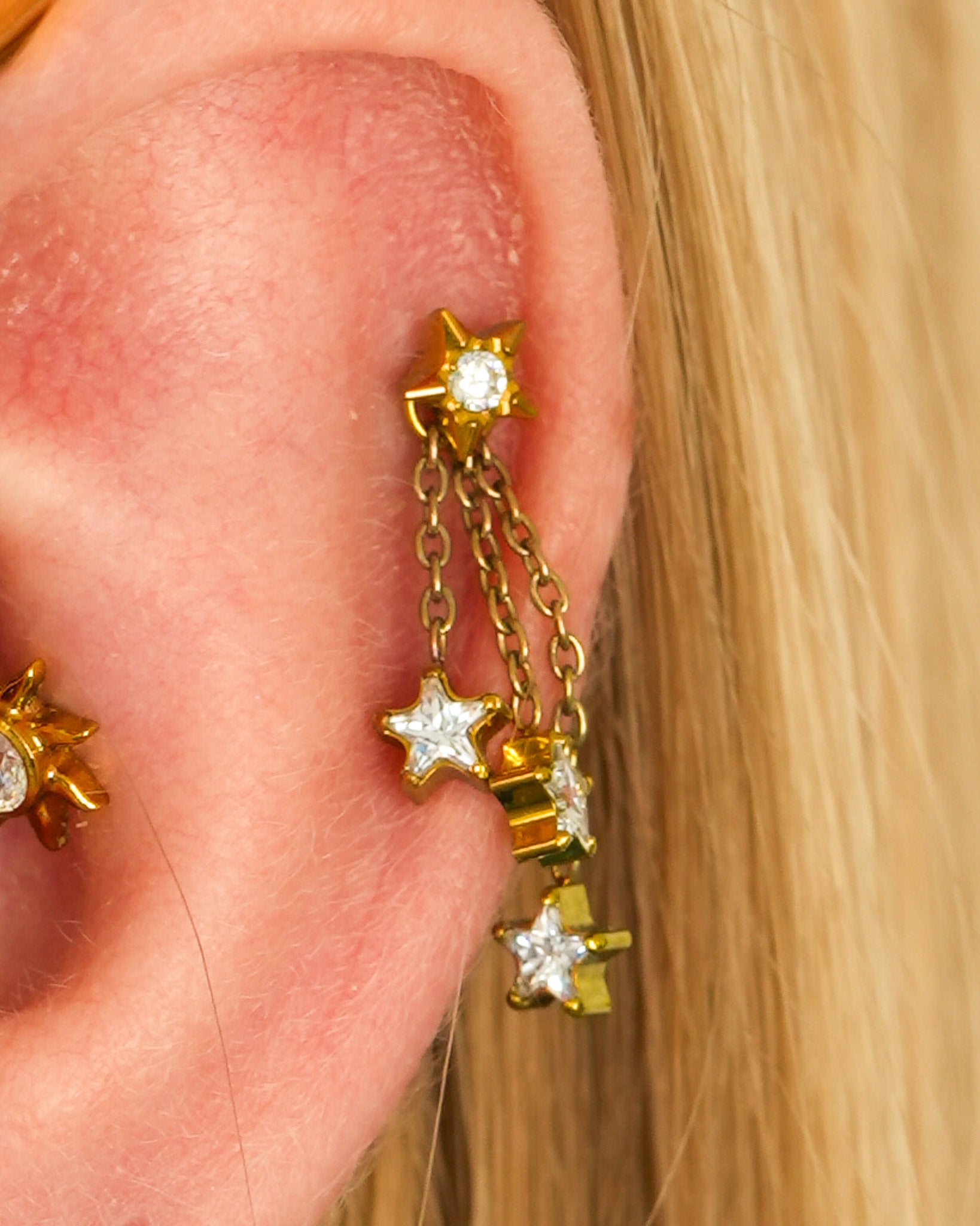 „Falling Stars” w złotej odsłonie to połączenie delikatności i elegancji. Trzy drobne gwiazdki zawieszone na lekkich łańcuszkach tworzą przy każdym ruchu subtelny, migoczący efekt, który natychmiast przyciąga uwagę. Złota barwa dodaje biżuterii luksusowego charakteru i sprawia, że idealnie pasuje zarówno do codziennych stylizacji, jak i bardziej wieczorowych kompozycji.