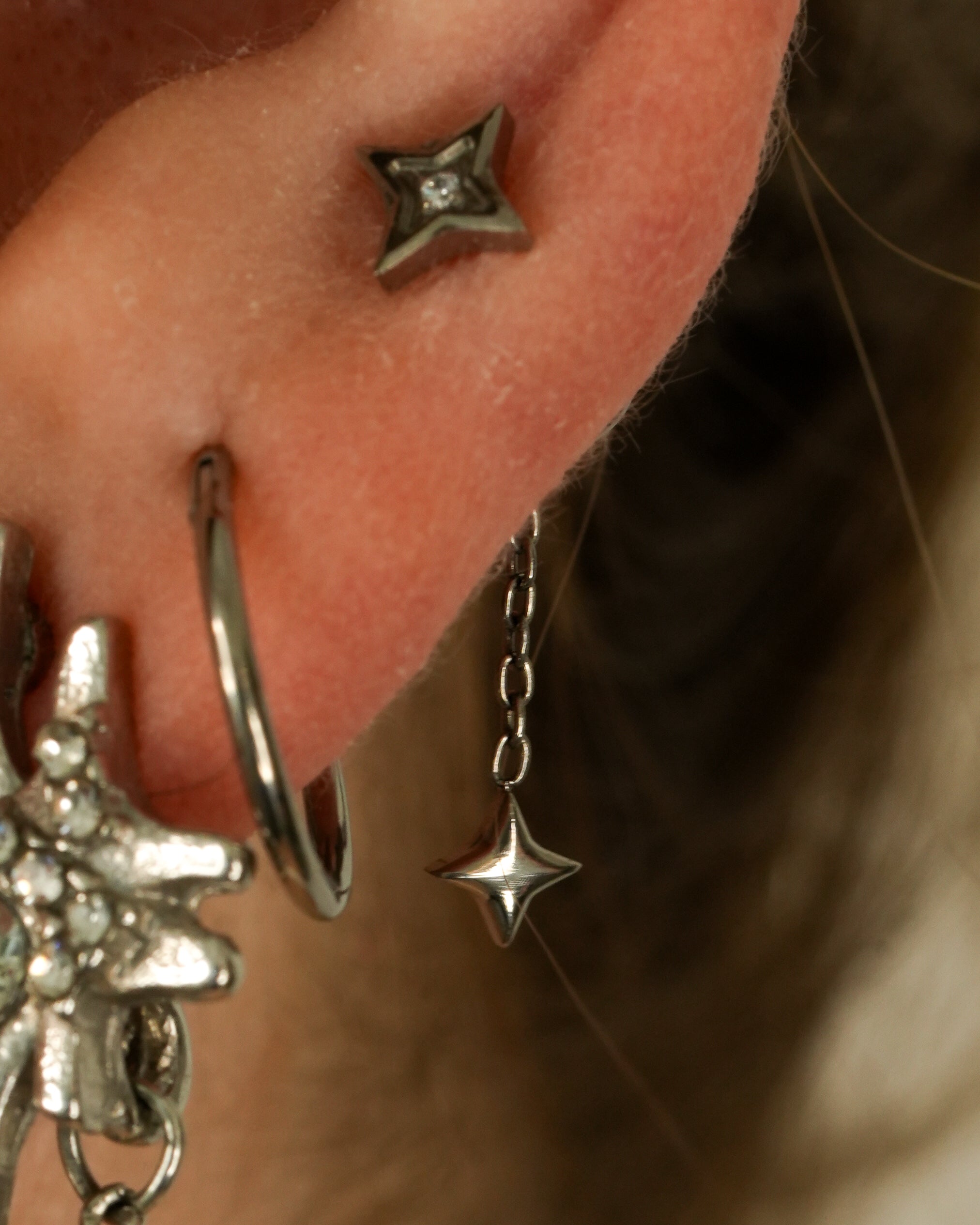 „Hanging Star” to minimalistyczna, ale niezwykle efektowna zawieszka w formie delikatnej gwiazdki na subtelnym łańcuszku. Jej gładka, lśniąca powierzchnia odbija światło przy każdym ruchu, tworząc elegancki i jednocześnie lekko kosmiczny efekt. Idealnie podkręca look każdego labreta lub kolczyka z oczkiem, dodając całości charakteru i lekkości.